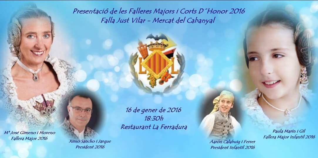 El próximo sábado 16 de Enero, en el Restaurante La Ferradura de la Patacona en Alboraya, tendrá el acto de Exaltación de las Falleras Mayores 2016 de la comisión Just Vilar-Mercat del Cabanyal: FMI la niña Paula Marín Gil y FM la señorita Mª José Gimeno Moreno.