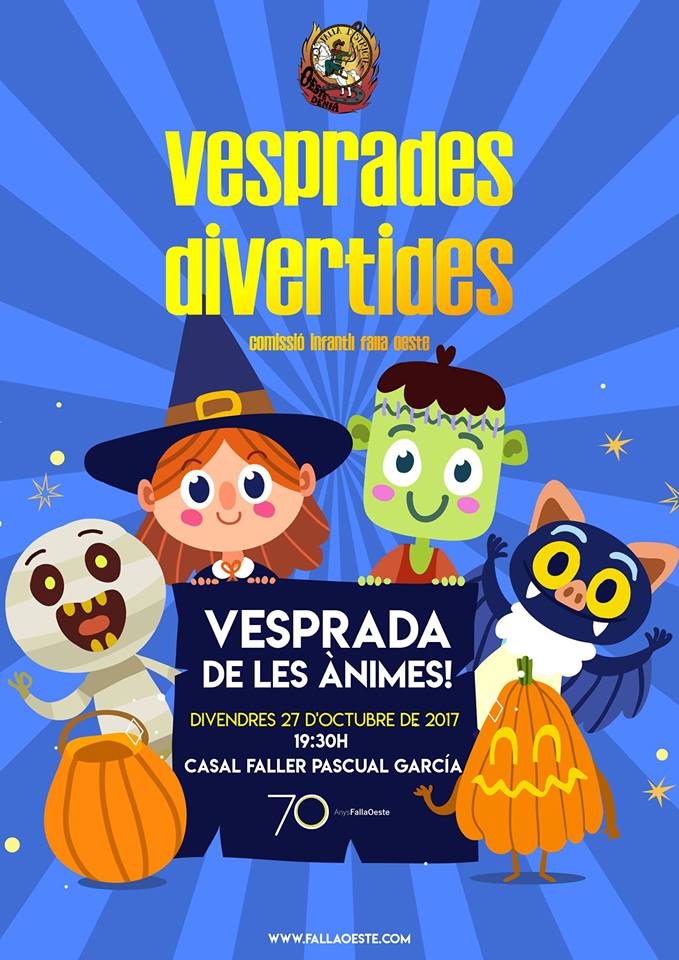 "Vesprada de les Ànimes¡" en la comisión de la Avenida del Oeste "Els Velluters" para los más pequeños de la comisión. Sobretodo este año que es el 70 Aniversario de esta céntrica comisión. A las 19:30h. empezará el evento en el Casal Pascual García.