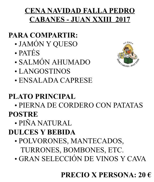 Ya comienza las Cenas Navideñas en los casales fallero. Hoy se reúne a las 21:30h. la comisión de Pere Cabanes-Joan XXIII. Por lo que se ve una excelente cena. Será una fiesta larga porque tienen previsto acabar sobe la 01:30h. Les deseo que lo paseen genial de todo corazón.