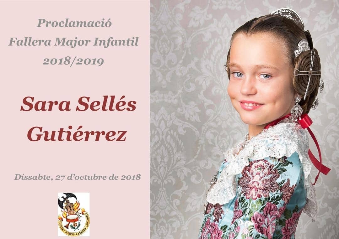 El próximo día 27de Octubre en el casal de la Falla Costa y Borrás-Agustina de Aragón, tendrá lugar el acto de Proclamación de Sara Sellés Gutiérrez, como Fallera Mayor Infantil 2019. de esta comisión.