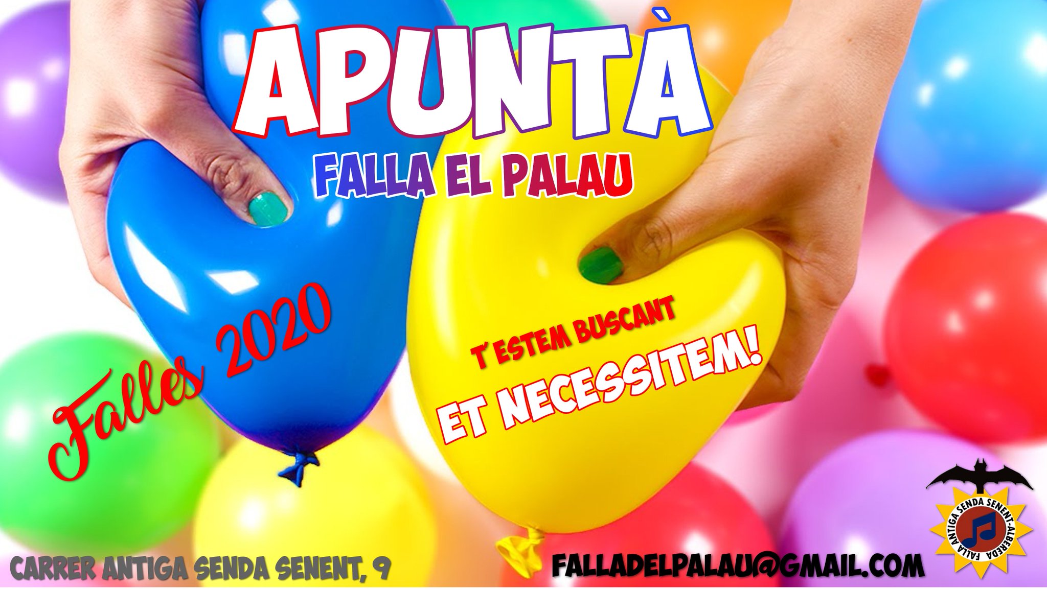 La Falla Antiga Senda de Senent-Paseo de la Alameda te invita a unirte a pasar un año inolvidable como fallero/a de su comisión. Si quieres ser Fallero, está es tu falla. Para más información en el correo electrónico Falladelpalau@gmail.com ó en el casal situado en la Calle Antiga Senda Senent, 9.